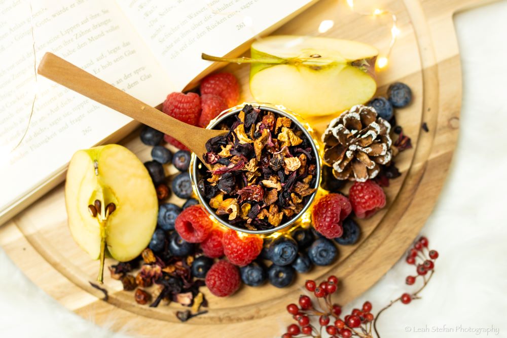 Zutaten: Hagebuttenschalen, Hibiskusblüten, Holunderbeeren, Orangenschalen süß, Zimtrinde ceylon, Süßholzwurzel, Nelken, Anis, Cayennepfeffer