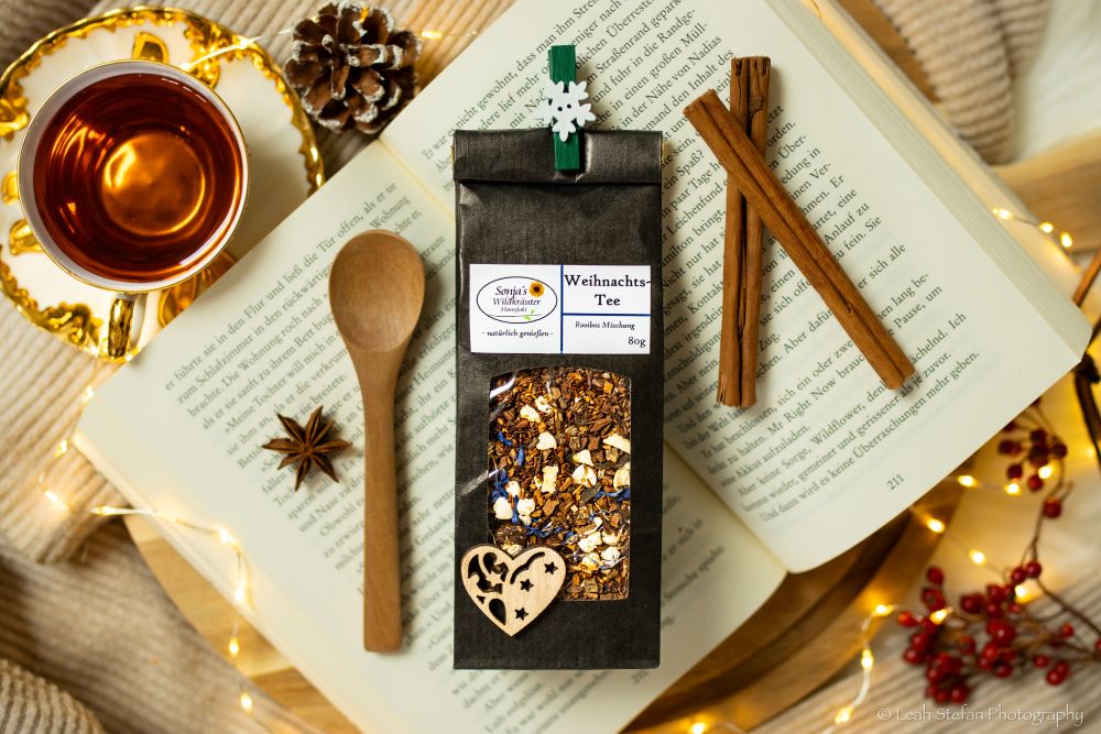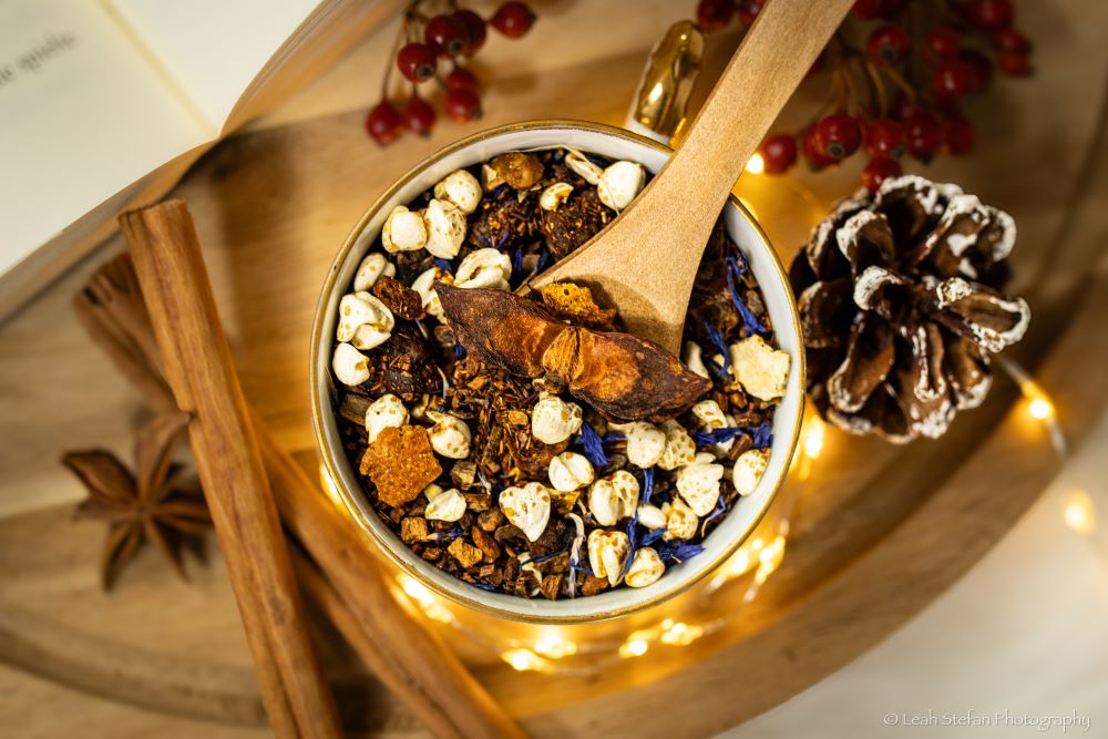 Zutaten: Rooibos, Zimt,Dattelstücke, Honeybush, Orangenschalen, Tonkabohne, Buchweizen, Sternanis, Mandarinenstücke, Nelken, Kornblumen, Vanillestücke